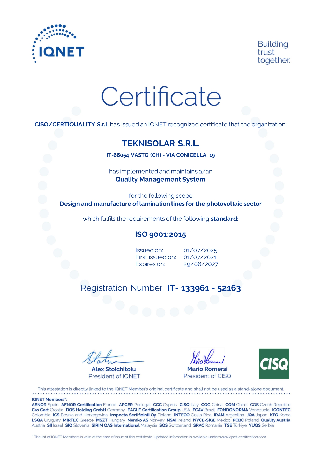 For this reason, Teknisolar has worked on the establishment and maintenance of a Quality Management System in compliance with the UNI EN ISO 9001: 2015 standard, aimed at maximum customer satisfaction, through compliance with the requirements defined for our products and yearly goals.